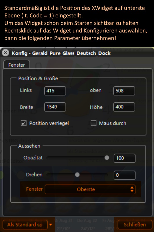 Wie in XWidget üblich läßt sich die gespeicherte Konfiguration über Klick mit rechter Maustaste auf das Widget dann >Fenster< >Funktionen< >Standard Konfiguration laden< wieder herstellen.