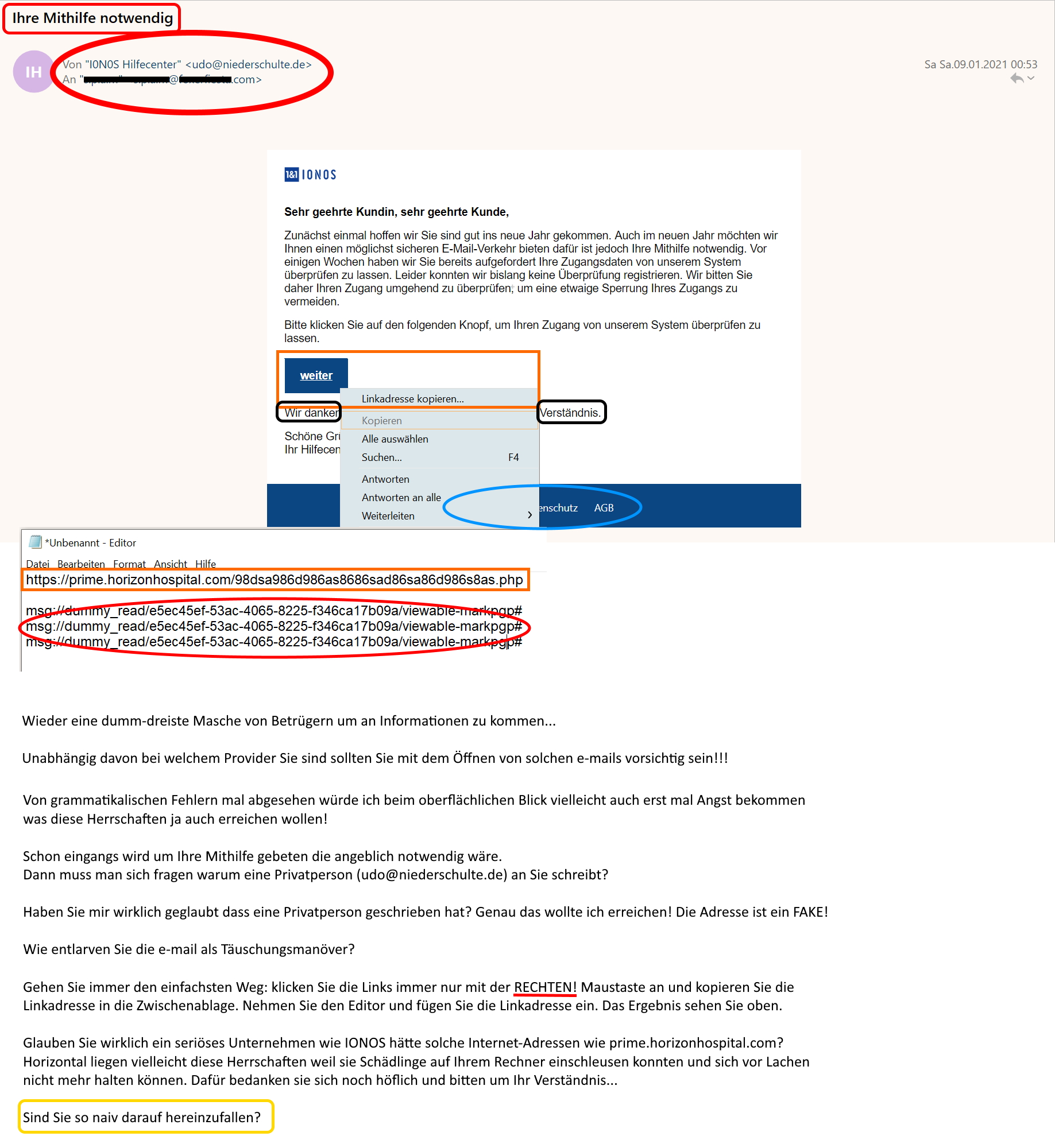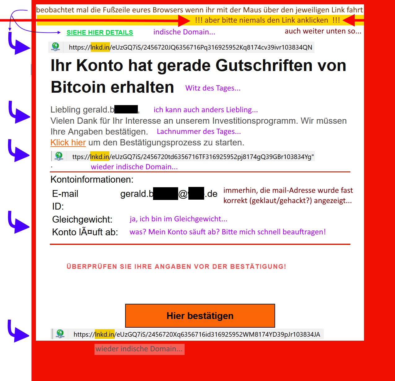 Öffnen Sie niemals Links aus e-mails die sich mit ihrem Geld oder Daten aus Online-Banking, angeblich offenen Rechnungen, grundloser Eingabe von persönlichen Daten in Formularen, Gewinnspiel und/oder rechtlichen Forderungen zeigen! Gilt auch für versprochene Reichtümer!
