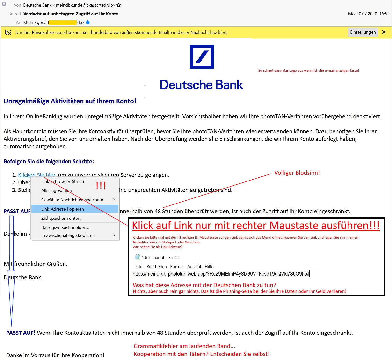 Das Prinzip ist genauso einfach. Aus Datenbeständen die gesammelt, gekauft, geklaut oder gehackt wurden werden wild und massenweise solche e-mails an die e-mail-Adressen aus dem Datenbestand versendet in der Hoffnung dass sich wie hier Kunden der Bank angesprochen fühlen und den enthaltenen Link anklicken. Ja, und genau so werden diese Kunden in die Falle gelockt indem Trojaner installiert oder gefälschte Seiten der Bank zur Dateneingabe verlocken oder sogar auffordern.