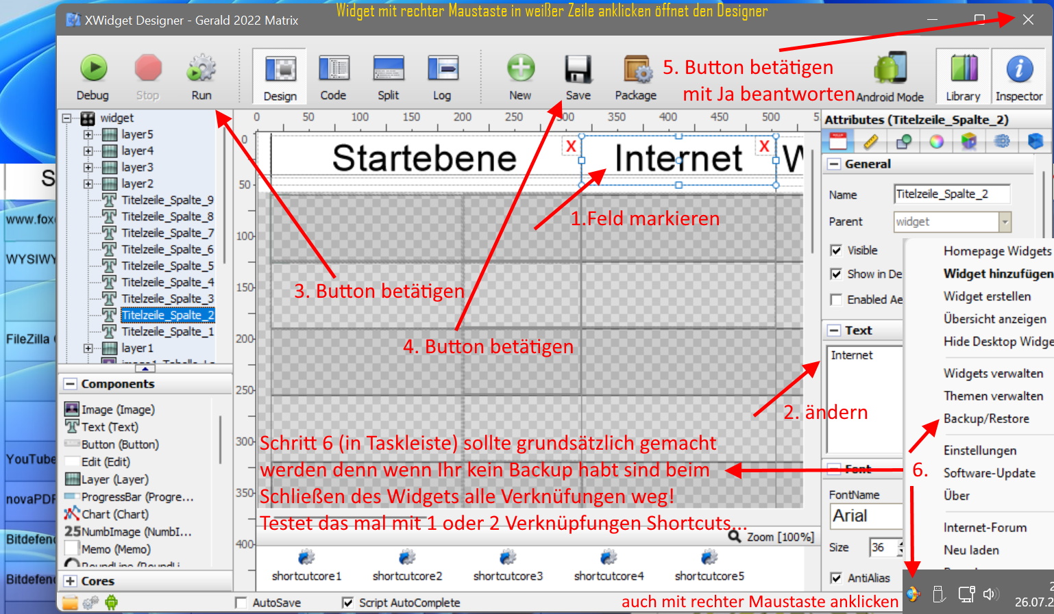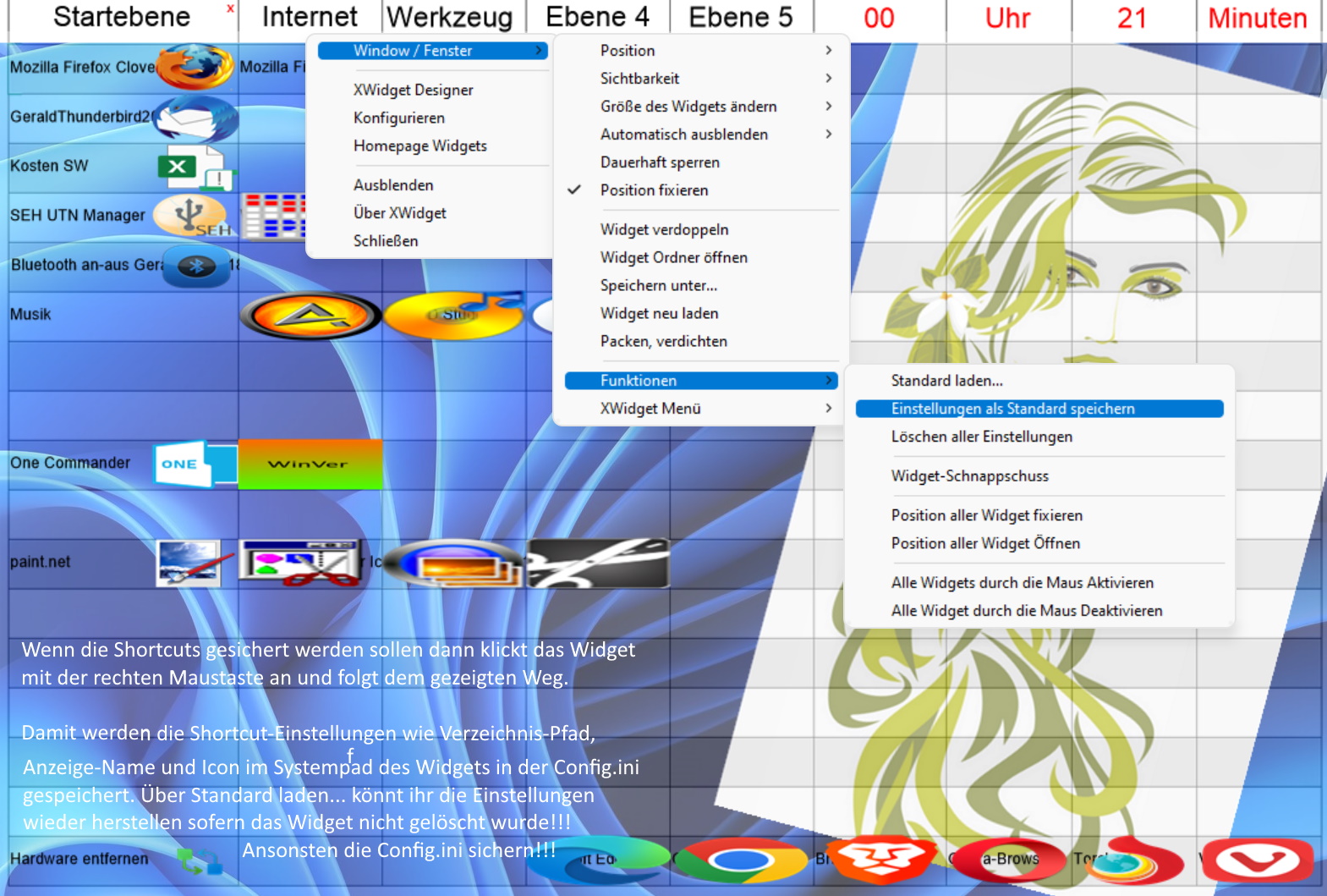 Zunächst sind nach dem Download und dem Starten des Widgets die Startebene 1 und die Ebenen 2 bis 5 sichtbar und auch so beschriftet. Die Beschriftung läßt sich relativ einfach mit dem XWidget-Designer in den Bezeichnungen ändern. Die Doku dazu findet Ihr rechts am unteren Rand des obigen Bildes, achtet dort besonders auf den Punkt 6 Backup (wie sonst auch..) Alternativ zum Punkt 6 könnt Ihr auch die config.ini sichern wenn Ihr wie ganz oben beschrieben die Shortcuts gesichert habt.... mit beidem seid Ihr auf der sicheren Seite!