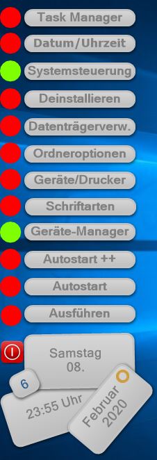 Ein streng formales Widget neben Datum, Uhrzeit und Kalenderwoche mit folgenden Möglichkeiten: - Klick auf einen der linken Punkte öffnet die rechts angegebene Aufgabe - Klick auf den roten eckigen Button öffnet das Windows-Auswahlmenü Benutzer wechseln / Abmelden / Energie sparen / Herunterfahren / Neu starten - Klick auf den gelben Kreis öfnet den Gott-Modus!