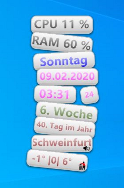 Unterhalb dann der Wochentag, die aktuelle Uhrzeit, die Auslastung der CPU, Ihr eingestellter Ort für das Wetter, drei Pfeile zur Steuerung der Lautstärkenregelung (Klick = Lautstärke stumm, Doppelklick = Lautstärke Wert 20, Mausradbewegungungen erhöhen bzw. reduzieren die Lautstärke um die Werte 1, 5 oder 10)., Auslastung RAM, nochmal die aktuelle Uhrzeit und den Wochentag.