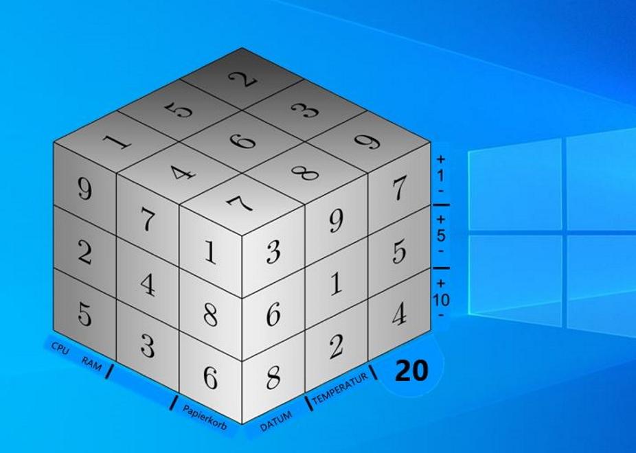 Eine optische Augenweide fast schon zu schön um mit Shortcuts belegt zu werden... 3D-Darstellung in Form von Sudoku-Feldern... Insgesamt 27 Shortcuts Vor allen Dingen optisch ein ganz anderes Aussehen wenn alle Shortcuts mit Icons bestückt sind. Probieren Sie es aus! Hier erstmalig eine Erweiterung der Lautstärkeregelung am rechten Rand des Würfels: es gibt nun 3 Bereiche die das Verändern der Lautstärke zulassen +- 1 Prozentpunkt, +- 5 Prozentpunkte, +- 10 Prozentpunkte (wie das geht lesen Sie oben unter Hinweis) Die Lautstärke wird hier im Beispiel als 20 (Prozentpunkte) angezeigt; unterhalb der Würfelkanten noch ein paar Systeminformationen, einfach Mauszeiger darauf stellen