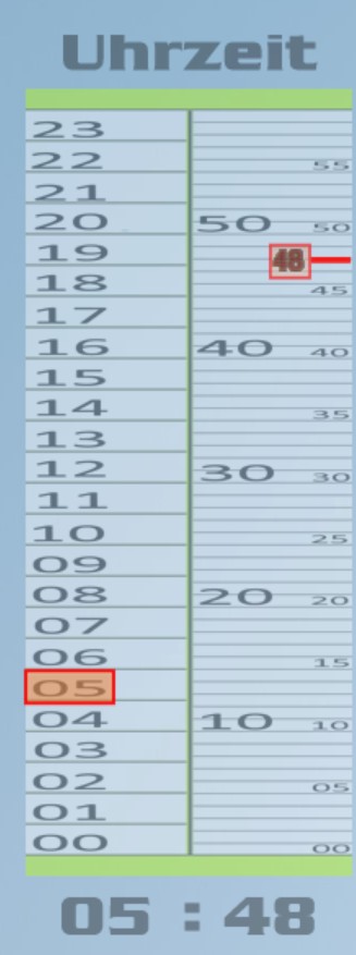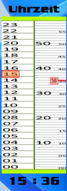 Links sehen Sie die Stunden die mit einem roten Balken unterlegt die aktuelle Stunde anzeigen. Rechts die Minuten ebenfalls in der Anzeige der aktuellen Minute mit einem roten Balken unterlegt. Die 10er Teilung der Minuten dient der Erkennbarkeit wenn Sie das Widget skalieren!